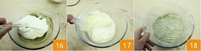 1/3 to the pistachio cream 16 and 1/3 to the white chocolate cream 17. Cover the 3 creams with plastic wrap in contact 18 and place in the refrigerator to set for at least 2 hours.