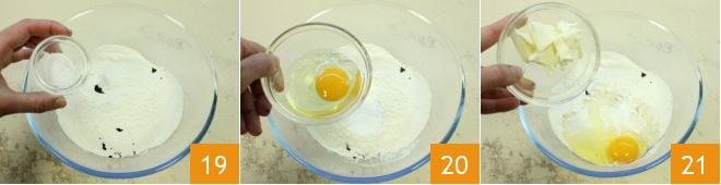 In the meantime, work on the chiacchiere; to do so in the best way, consult our Chiacchiere (Sweet fried dough) recipe: in a bowl, place the sifted flour and baking powder 19, add the vanilla bean seeds, the eggs 20, the butter in pieces 21,