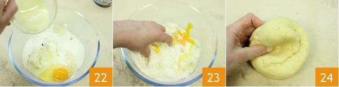 a pinch of salt, the condensed milk 22. Knead by hand with your fingertips for at least 10 minutes the ingredients 23 until a smooth and homogeneous dough is formed 24.