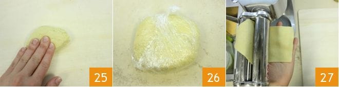 Take a portion of the dough 25 and cover the rest with plastic wrap so it won't dry out 26, roll out the dough with the appropriate machine to the narrowest roller (or with a rolling pin) to obtain a thin sheet 27.