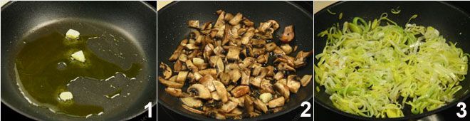 To prepare the mini quiches with mushrooms, leeks, and cooked ham, start by cleaning and chopping the champignons; sauté a clove of garlic in a non-stick pan with two tablespoons of oil 1 and cook the chopped mushrooms 2, season with salt and pepper. Meanwhile, in another pan with a tablespoon of oil, cook the cleaned and thinly sliced leeks for about 15/20 minutes 3.