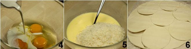 In a bowl, beat 4 eggs with the cream 4, mixing well and incorporating the Grana Padano cheese 5, then adjust the salt and pepper. Butter 14 oven molds with a diameter of about 3 inches, or muffin molds (in this case, the mini quiches will be even smaller) and cut the puff pastry into circles with a diameter of about an inch or two wider than your molds, using a glass or a small bowl 6.