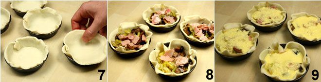 Finally, line the molds with the puff pastry discs 7 and start filling them. Add the champignon and leek mixture to each quiche, the cooked ham cut into small pieces 8, and pour the egg, cream, and Grana Padano mixture over it until they are filled 9. The quiches should then be baked at 356°F (fan oven) for about 20 minutes, until they have a nice golden appearance. Serve the mini quiches with mushrooms, leeks, and ham hot!