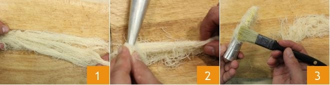To make the mini savory croissants with salmon and stracchino, unravel the kataifi dough and create a sort of ribbon 1 then take steel cones and brush them with butter, wrap the phyllo dough strip around the cone starting from the pointed end of the cone 2 moving towards the wider part 3.