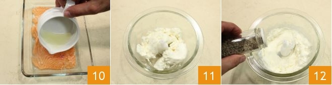 Then drizzle with lemon juice 10, cover with plastic wrap, and store the marinated salmon in the refrigerator. Meanwhile, prepare the cream: place the stracchino in a mixer with blades 11, season with salt, pepper 12.