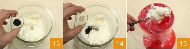 Blend until creamy, then add black 13 and white sesame seeds 14, and mix to flavor. Transfer the obtained cream into a pastry bag with a star nozzle 15.