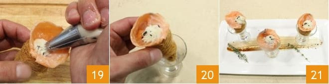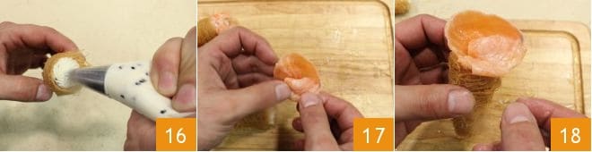 Squeeze a tuft of cream inside each mini croissant 16, take the salmon slices and roll them to form petals 17, place a petal on top of each croissant 18.