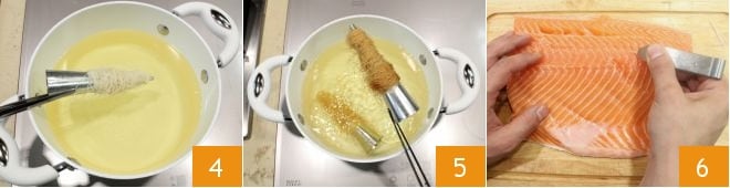 Brush the dough with beaten egg 4. Fry in hot seed oil at 338°F (for optimal cooking, use a food thermometer), until golden brown (about 3 minutes), then drain the croissants using kitchen tongs 5 and place them to dry on a tray lined with absorbent paper. Prepare the salmon: if you are certain you've purchased Norwegian salmon, no further precautions are needed. Otherwise, ensure you've purchased frozen fish and freeze it for at least 96 hours at 0°F before using it in the recipe: remove bones with tweezers 6.