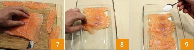 Cut 8 slices from the fillet, cutting diagonally 7, place the slices in a wide dish without overlapping 8, and sprinkle salt and sugar over the surface 9.