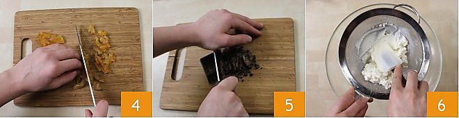 Proceed with the filling preparation: cut the candied orange into pieces 4 and chop the dark chocolate into flakes 5. Sift the ricotta very well by passing it through a sieve 6 and