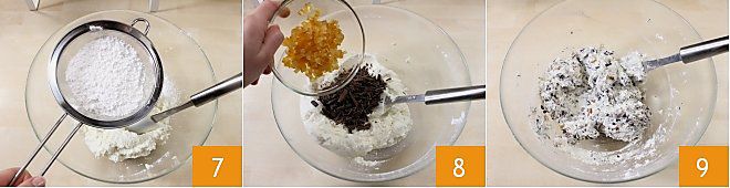add the powdered sugar, also sifted 7, then mix the ingredients. Add the pieces of candied orange and chocolate 8; finally, if you want a more fruity aroma, also add the grated zest of an orange. Mix everything to obtain a homogeneous mixture 9.