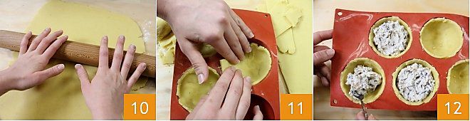 Take the pastry and roll it out with a rolling pin into a sheet about 1/4 inch thick 10 and line semi-spherical molds with it 11 (we used silicone molds with a diameter of 3 inches, capacity 1/2 cup), then fill them with about 2.8 oz of ricotta 12.