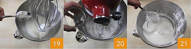when the mixture is semi-whipped, add the powdered sugar one tablespoon at a time, and finally the lemon juice (19-20). The consistency of the glaze should not be too firm and glossy but should "write" 21, leaving a trail when falling from above.