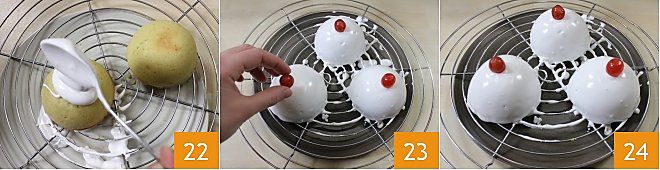 Cover the Saint Agatha's breasts well with the glaze, letting it flow evenly over the dessert 22, then finish the decoration with a candied cherry placed on top of each dessert 23. Let dry on the rack to let the excess glaze fall off 24. The Saint Agatha's breasts are ready: they can be consumed when the glaze is still soft or let it dry completely 24.