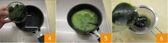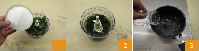 To make the mint cake, start by preparing the mint syrup the day before as follows: put the mint leaves 1, granulated sugar 2, and blend everything well in a mixer. Pour the water into a small pot 3