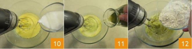 Then pour in the milk 10 and 7.75 oz of previously prepared mint syrup 11; then, continuing to work the dough with the whisks, add the flour 12,
