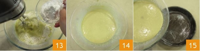 the cornstarch 13 and the baking powder until you get a homogeneous mixture 14. Butter a 9.5-inch diameter cake pan and pour the mixture into it 15.