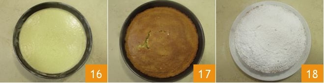 At this point 16 bake in a preheated static oven at 356°F for 40 minutes. Once cooked, remove the mint cake from the oven 17 and, once it has cooled, remove it from the mold and dust it with powdered sugar before serving it 18.
