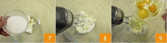 You can proceed with the cake preparation: in a bowl, place the butter in pieces and the sugar 7, beat the mixture with electric whisks 8 and work it until it becomes frothy. Add the eggs one at a time 9, continuing to work with the whisks, and mix everything well.