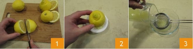 To prepare mint lemonade, start by removing any leaves from the lemons, if present, then rinse them, dry them, and cut them in half 1. To get the most juice, squeeze all the lemon halves with a juicer 2, then pour the juice into a container where you have placed a fine mesh strainer 3.