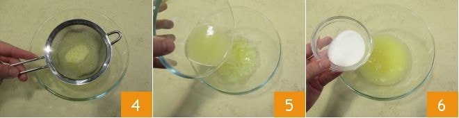 This way you'll filter the juice, preventing pulp and seeds from ending up in the lemon juice 4. Then pour the juice into a larger container, you should have about 15 oz 5, and add the sugar 6.