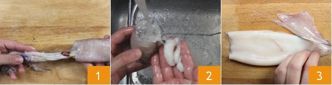 To make the mint, pea, and squid risotto, start with the squid. If you bought whole squid, clean them following the instructions on our sheet how to clean squid: detach the head and remove the internal cartilage 1, rinse them under running water 2, and remove the skin and fins 3.