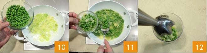 In another pan, sauté the remaining half of the leek with a drizzle of olive oil, soften over low heat for 5 minutes, add the peas 10, and continue cooking, adding broth little by little to prevent the vegetables from drying out. Cook for 10-15 minutes, then take 3-4 tablespoons of peas 11, transfer them to a tall and narrow container, and blend with an immersion blender 12