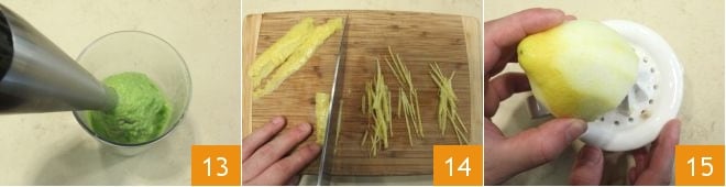 to obtain a homogeneous cream 13. Meanwhile, as the rice continues to cook, prepare the squid: slice the lemon zest into strips 14 and squeeze out the juice 15.