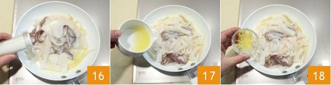 Separately, sauté the squid rings in a pan with a drizzle of olive oil and salt 16. Flavor with lemon juice 17 and zest 18.