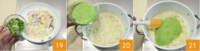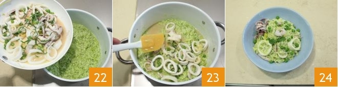 Finally, add the sautéed squid 22. Stir everything, keeping the heat very low 23, and serve the mint, pea, and squid risotto hot 24.
