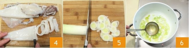 Cut the squid into rings 4, then thinly slice the leek 5 and place half of it in a saucepan, add the olive oil and sauté over low heat. Then pour in a ladle of Vegetable broth 6 and continue cooking to soften the leek; this will take at least 5 minutes.
