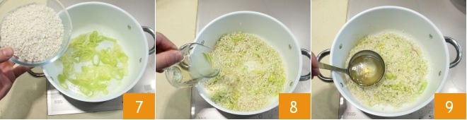 Add the rice at this point 7, toast it for a few minutes, then deglaze with white wine 8. Continue cooking the risotto by occasionally adding a ladle of broth 9.