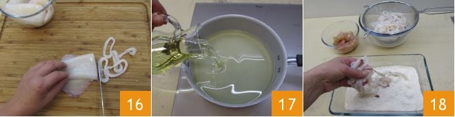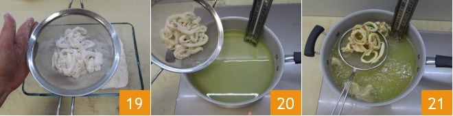 then remove the excess flour by sifting the calamari with a colander 19. When the oil has reached the indicated temperature, you can fry the calamari, a few at a time 20 to prevent lowering the oil temperature too much and risking a soggy fry. It will take just a few moments, and you can drain the golden calamari using a slotted spoon 21.