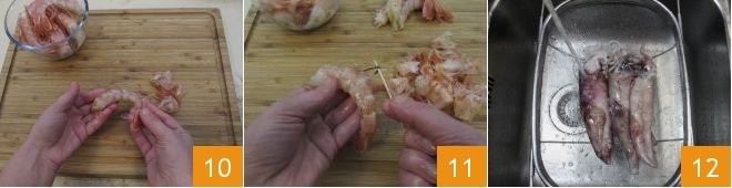 then remove the shell 10 and eliminate the intestine (the black thread) from the back with the help of a toothpick 11. Set the shrimp aside and proceed to clean the calamari: rinse them under running water 12,