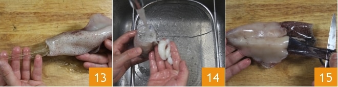 then remove the internal cartilage pen 13 and rinse them again to thoroughly clean the inside of the mantle 14. Then remove the skin with the help of a small knife 15