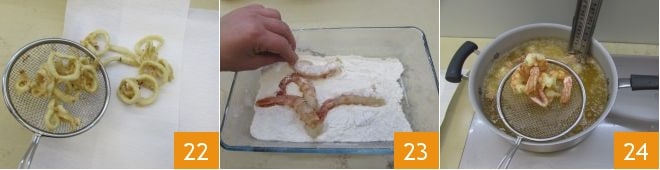 Place them on a sheet of absorbent paper 22 and proceed in the same way with the shrimp: coat them thoroughly in flour 23, remove the excess flour with a sifter, then proceed to fry them in the heated oil, again a few at a time. When they are well golden, drain them with a slotted spoon 24