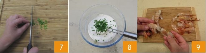 Finally, chop the chives 7 and add them to the mayonnaise and yogurt sauce 8. Then keep it in the refrigerator until it's time to use it and proceed to prepare the fry. Start by cleaning the shrimp: remove the head 9,