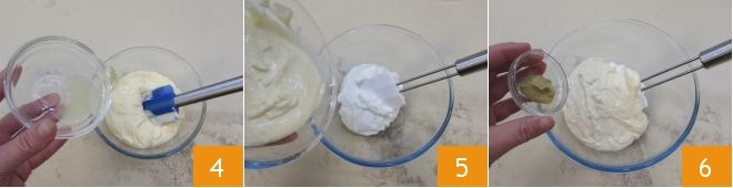 Pour in the lemon juice 4 and gently mix with a spatula. Then add the mayonnaise to a bowl where you have placed the Greek yogurt 5, mix the mixture thoroughly and add the mustard 6.