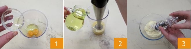 To prepare the mixed fried calamari and shrimp with mayonnaise and yogurt sauce, start with the accompanying sauce: in a small bowl, pour the whole egg and yolk, add the white wine vinegar 1, mix the ingredients with a fork, then pour them into a tall graduated glass, and begin blending with an immersion blender while slowly drizzling in the seed oil 2: this step prevents the mayonnaise from "breaking." You should achieve a smooth and creamy mixture. Transfer it to a small bowl, adjust with salt and pepper 3.