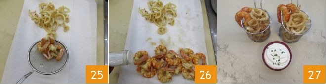 and place them on absorbent paper to drain off excess oil 25. Salt the fry to taste 26 and serve the mixed fried calamari and shrimp with mayonnaise and yogurt sauce 27!