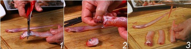 Proceed to clean the fish by removing the head 1 and guts 2. In the case of cepolas, remove the dorsal and ventral fins running along the body by cutting them with scissors, then cut the fish into three parts 3.