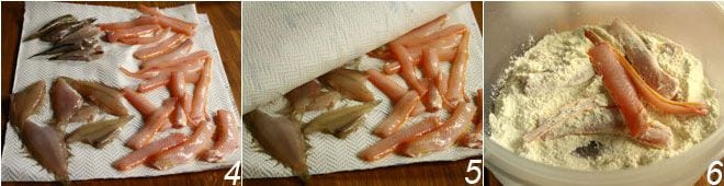 If necessary, quickly rinse the fish under running water 4, pat them very well with kitchen paper to make them perfectly dry 5, and coat them in coarse semolina flour 6.