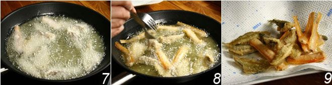 Fry the fish in plenty of seed oil 7 (peanut oil is preferred) which you should maintain at the constant temperature of 347°F without ever exceeding it. Turn the fish over during frying 8 and once golden, drain them and place them on kitchen paper 9 to remove excess oil. Salt and serve immediately, accompanying the fry with a mixed salad or delicious French fries.