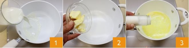 To prepare the Mornay sauce, grate the aged Asiago cheese, then in a saucepan, heat the milk 1, while in another melt the butter over low heat 2, add a pinch of salt when it is completely melted 3.