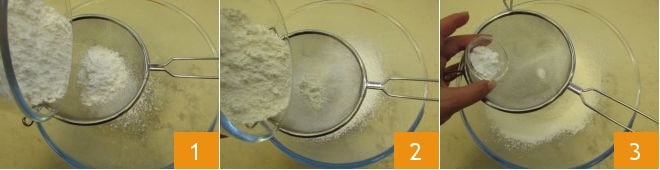 To make the morning cake, start by sifting the potato starch 1 along with the flour 2 and baking powder 3 into a large bowl.