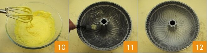Then mix with the electric mixer until you get a smooth, lump-free batter 10. Take a bundt cake mold with a diameter of 9 inches and height of 4 inches, grease the bottom and sides of the mold with a pastry brush 11 to ensure all surfaces are well greased, a crucial step if using a decorated mold like we used. Finally, dust the entire surface of the mold with flour 12.