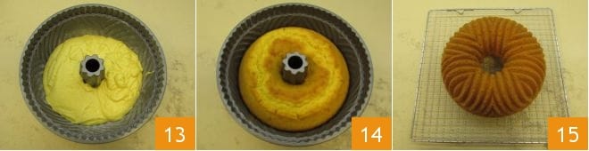 Pour the batter into the pan 13 and level the surface with a spatula or the back of a spoon. Bake the morning cake in a preheated static oven at 340°F for 40 minutes. Once cooked, remove the cake from the oven 14 and let it cool before turning it out onto a wire rack 15.