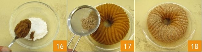 In a small bowl, mix the powdered sugar with ground cinnamon 16, then dust the aroma mixture over the cake 17. Your morning bundt cake is ready to be enjoyed for breakfast 18!