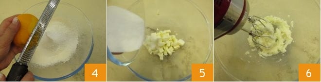 Grate the zest of an orange, which will be used to flavor the batter 4. Separately, in another bowl, place the softened butter cut into pieces, add the sugar 5, and beat the mixture with an electric mixer to obtain a cream 6.