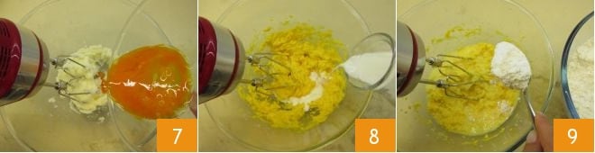At this point, add the whole egg and the room temperature yolk 7, and a pinch of salt. Continue beating the mixture, and with the mixer still running, slowly pour in the room temperature milk 8. Gradually add the dry ingredients to the egg and butter mixture, using a spoon 9.